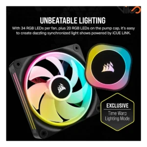 این مدل مجهز به سه فن ۱۲۰ میلیمتری QX120 RGB است که سرعت چرخش آنها بین ۴۸۰ تا ۲۴۰۰ دور در دقیقه (با تلورانس ۱۰٪) قابل تنظیم است. این فنها با حداکثر جریان هوای ۱۶.۴۴ تا ۶۳.۱ فوت مکعب بر دقیقه، خنککنندگی مؤثری ارائه میدهند. بلبرینگهای مغناطیسی نویز را کاهش داده و سطح صدا در حالت عادی حدود ۴۰-۴۲ دسیبل است. هر فن با ۳۴ LED RGB آدرسپذیر، نورپردازی جذابی ایجاد میکند که از طریق نرمافزار iCUE قابل تنظیم است.